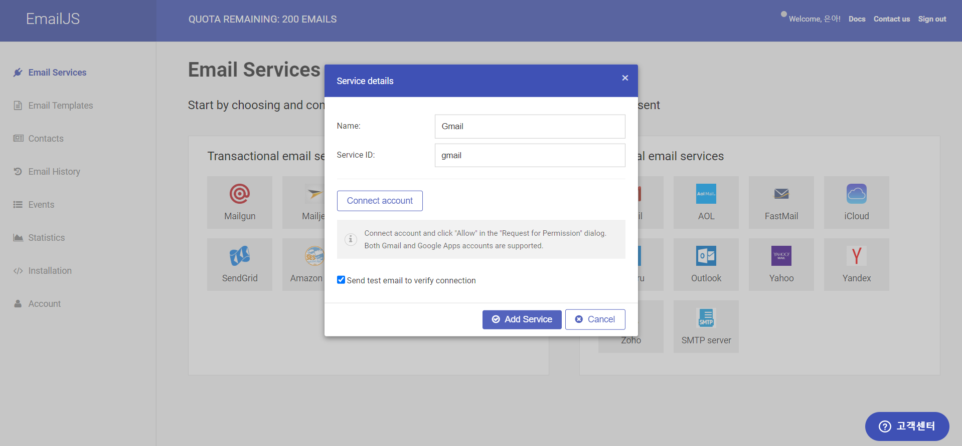 회사메일 또는 개인 이메일을 등록하는 부분인데 나는 Gmail을 선택했다. Gmail을 선택하면 아래와 같이 화면이 뜨는데 따로 텍스트를 수정하지는 않아도 되고, 저기 'Connect account'를 누른 후 메일 연동을 한 후 'Add Service'를 누르면 메일 연동이 완료된다!