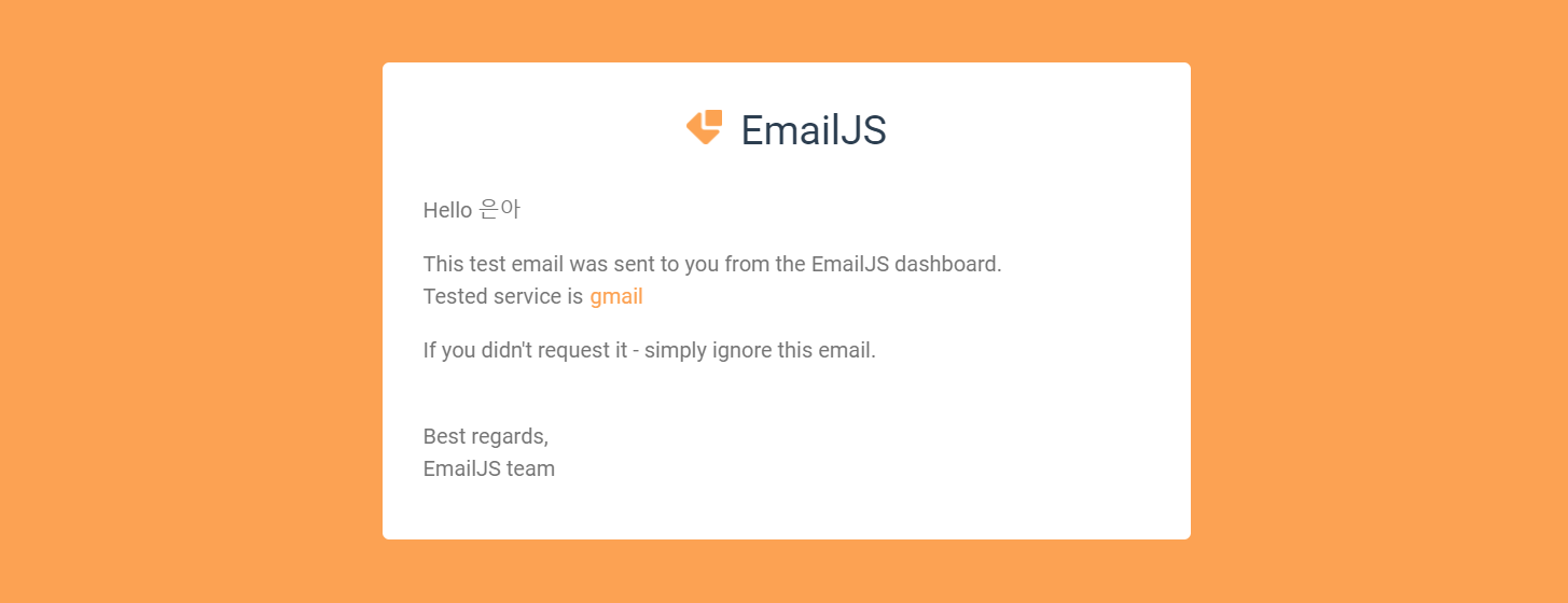 emailjs.send의 첫 번째 파라미터에는 Email Services에서 설정한 service ID를 적으면 되고, 두 번째 파라미터에는 Email Templates에서 자신이 사용할 템플릿의 ID를 적으면 된다. 마지막 파라미터는 보낼 내용이 담긴 객체를 쓰면 된다.