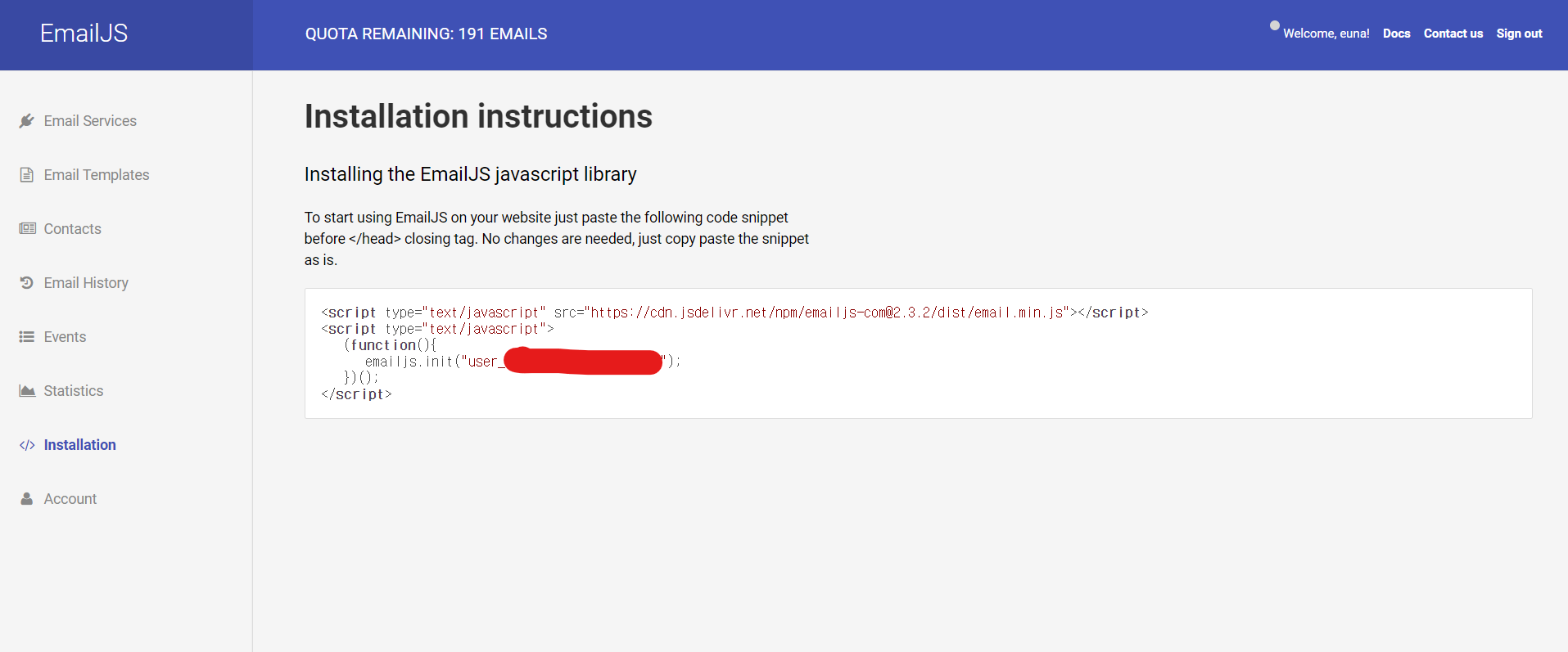 //"user_xxxxx"이 부분은 사용자마다 다르니 반드시 emailJS의 installation 화면을 확인