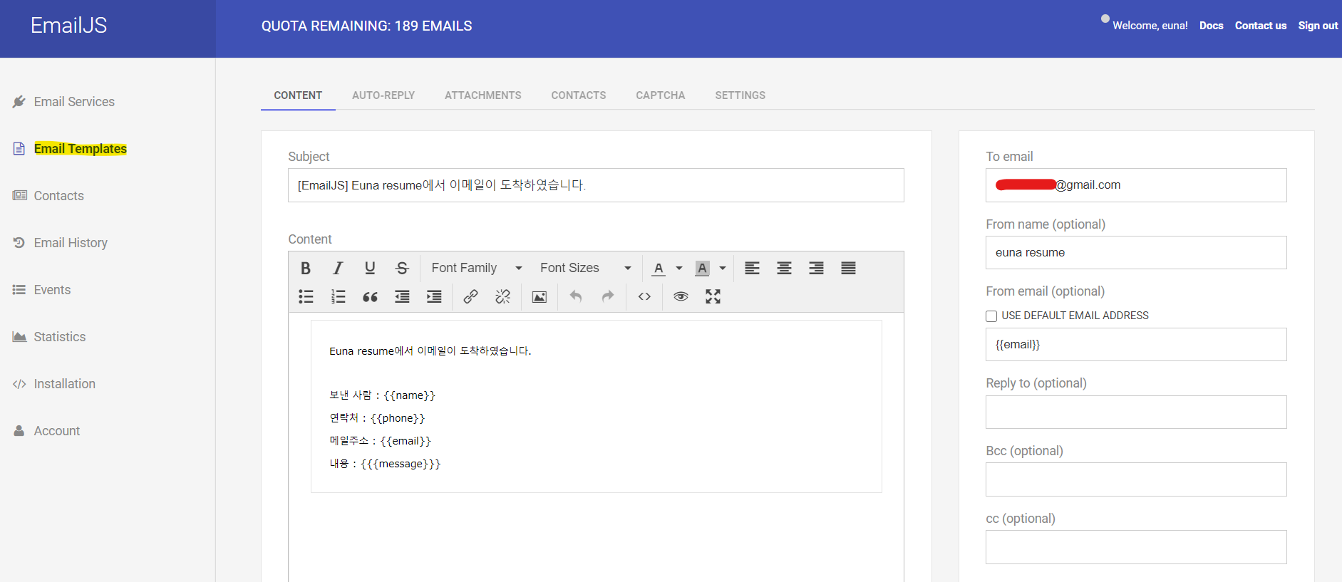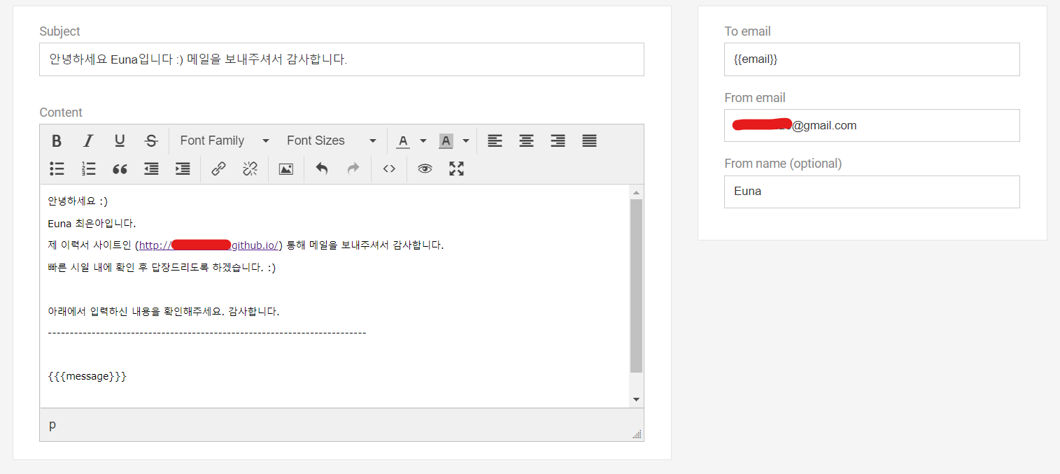그러기 위해서 보낸 사람, 연락처, 메일주소, 내용을 emailJS가 제공하는 템플릿에 저장해야 한다. emailJS에서 Email Templates에 들어가면 기본으로 생성된 템플릿이 하나 있는데 해당 템플릿을 눌러서 다음과 같이 수정하였다.