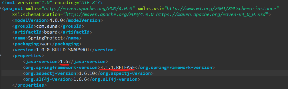 pom.xml의 <properties>를 보면 java-version은 '1.6', springgramework-version은 '3.1.1.RELEASE'로 되어있는 것을 볼 수 있다.