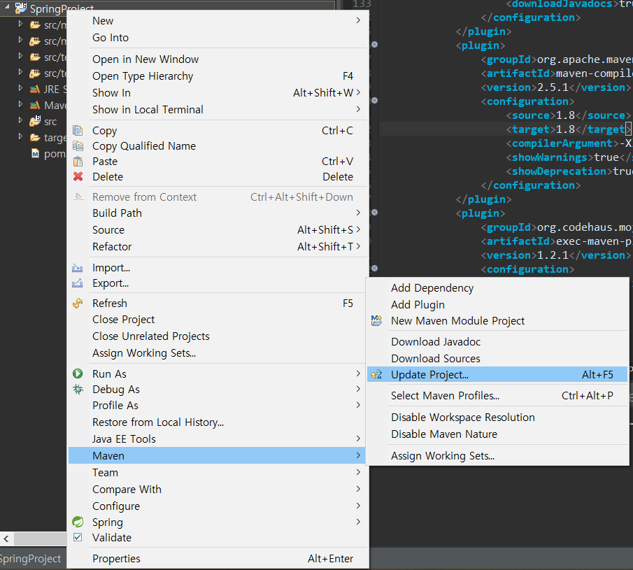 저장한 후, 프로젝트 마우스 우클릭>Maven>Update Project를 선택하여 Maven 수정사항을 반영한다.