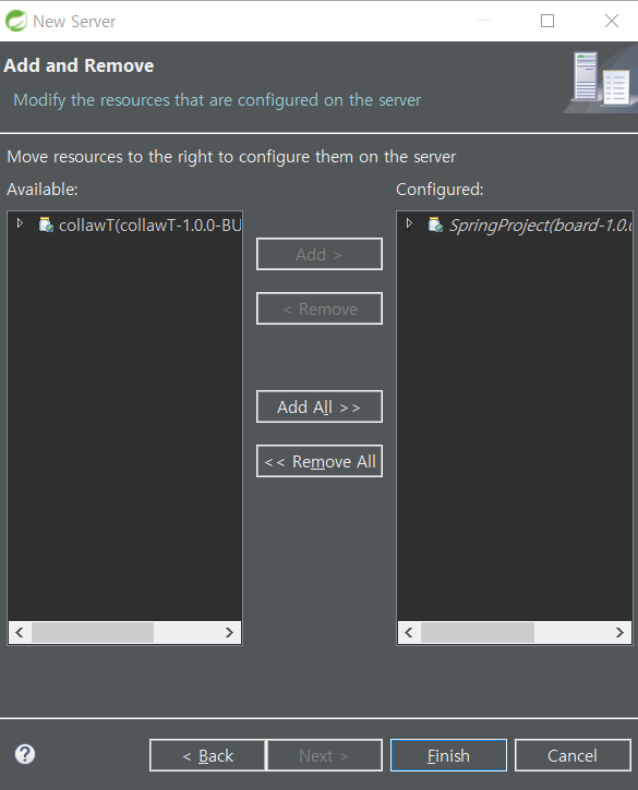 next를 눌러 Tomcat으로 돌릴 프로젝트를 선택한 후 완료!