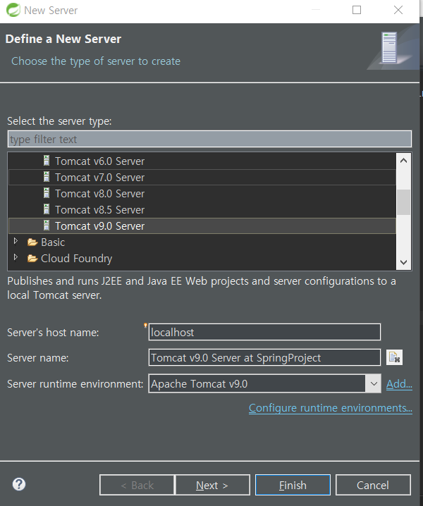 나는 Tomcat 9.0을 쓸 것이다. Server name은 다른 서버도 이미 만들어 둔 게 있어서 헷갈리지 않게 프로젝트명을 따서 바꿔두었다.