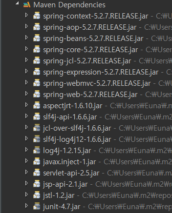 완료된 후 Maven Dependencies를 확인하면 이렇게 5.2.7로 바뀌어있는 것을 확인할 수 있다.