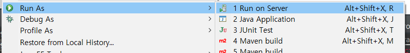 자, 이제 프로젝트를 선택하고 우클릭 > Run As > Run on Server를 선택한다.