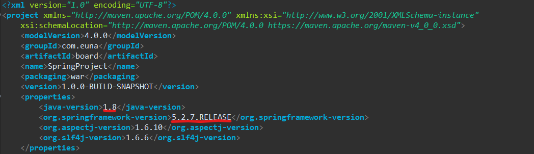 여기서 java-version을 1.8로 springgramework-version을 5.2.7로 바꿀 것이다.