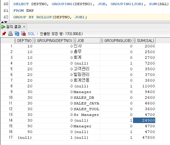 - 소계, 합계 등이 계산되면 GROUPING 함수는 1을 반환하고, 그렇지 않으면 0을 반환해서 합계 값을 식별할 수 있음