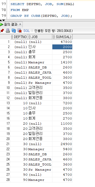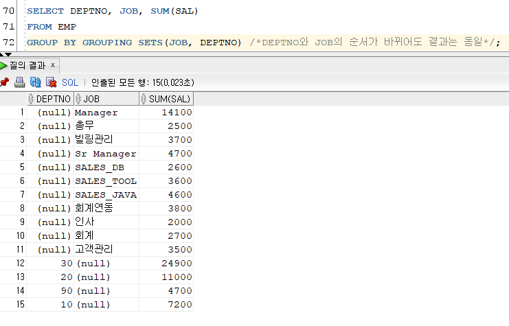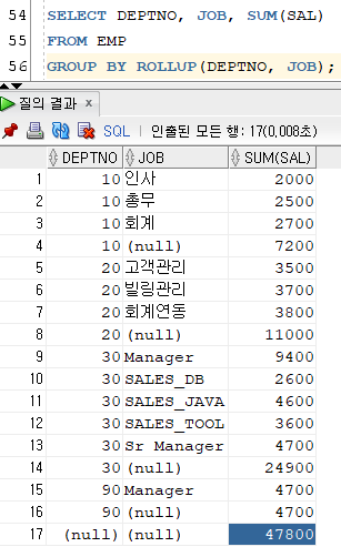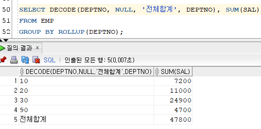 - UNION ALL을 사용한 일반 그룹함수를 사용한 SQL과 같은 결과를 얻을 수 있음