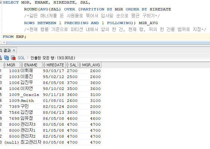 EX) 사원들의 급여와 같은 매너저를 두고 있는 사원들의 급여 합계![]()