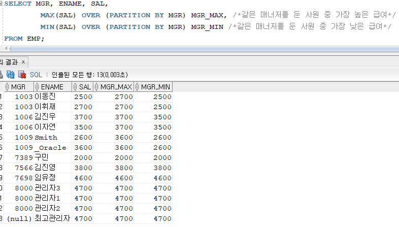 - MAX/MIN : 파티션 별로 최댓값/최솟값을 계산한다.