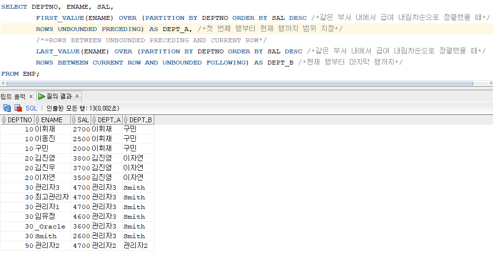 - FIRST_VALUE : 파티션에서 가장 처음에 나오는 값. MIN 함수를 사용하여 동일한 결과를 얻을 수 있음