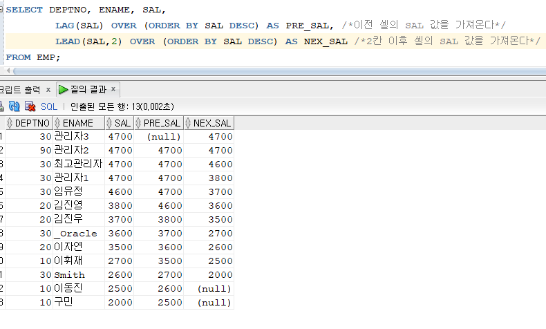 - LEAD : 윈도우에서 특정 위치의 행을 가지고 옴. 기본값은 1